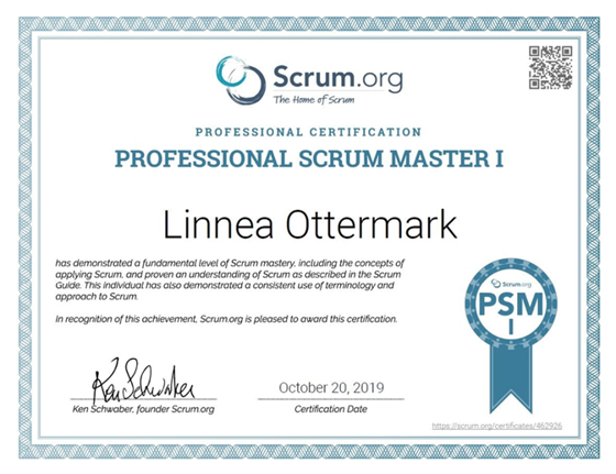 Efter genomförd utbildning skrev Linnéa certifieringsprovet och är numera Professional Scrum Master (PSM I). Certifikatet är utfärdat av Scrum.Org.
