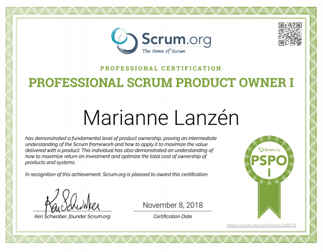 Marianne Lanzén certifierad Professional Scrum Product Owner I (PSPO I)