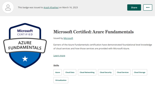 Arash Khadjavi har kompetensutvecklat sig inom Azure Fundamentals. Idag gratulerar vi honom till väl genomfört prov då han nu är certifierad av Microsoft i Azure Fundamentals!